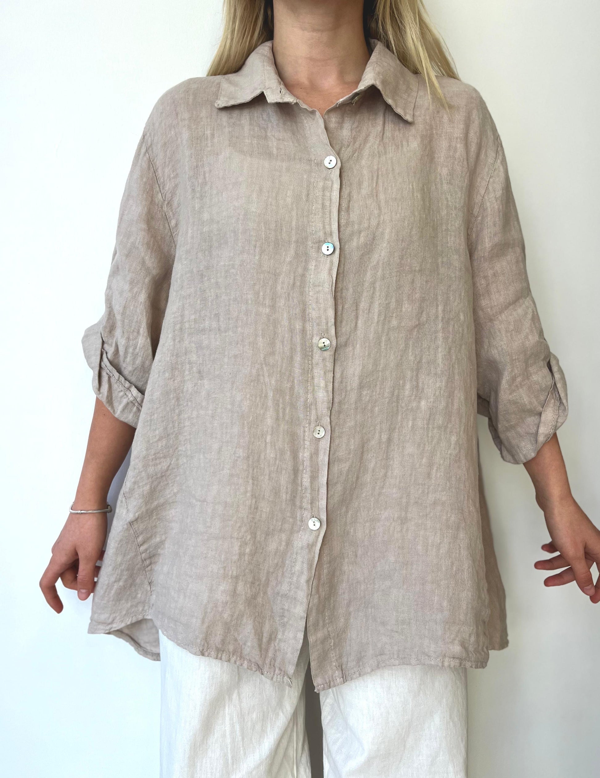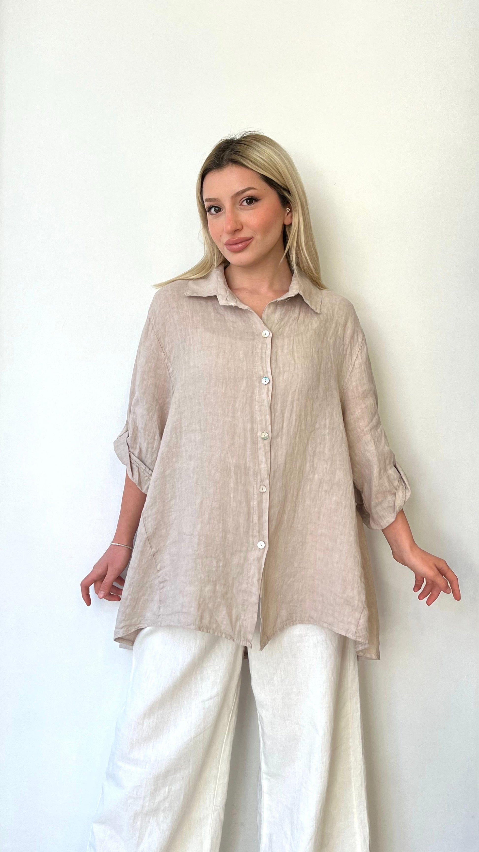 %100 keten, arkası uzun, oversize / rahat kalıp gömlek