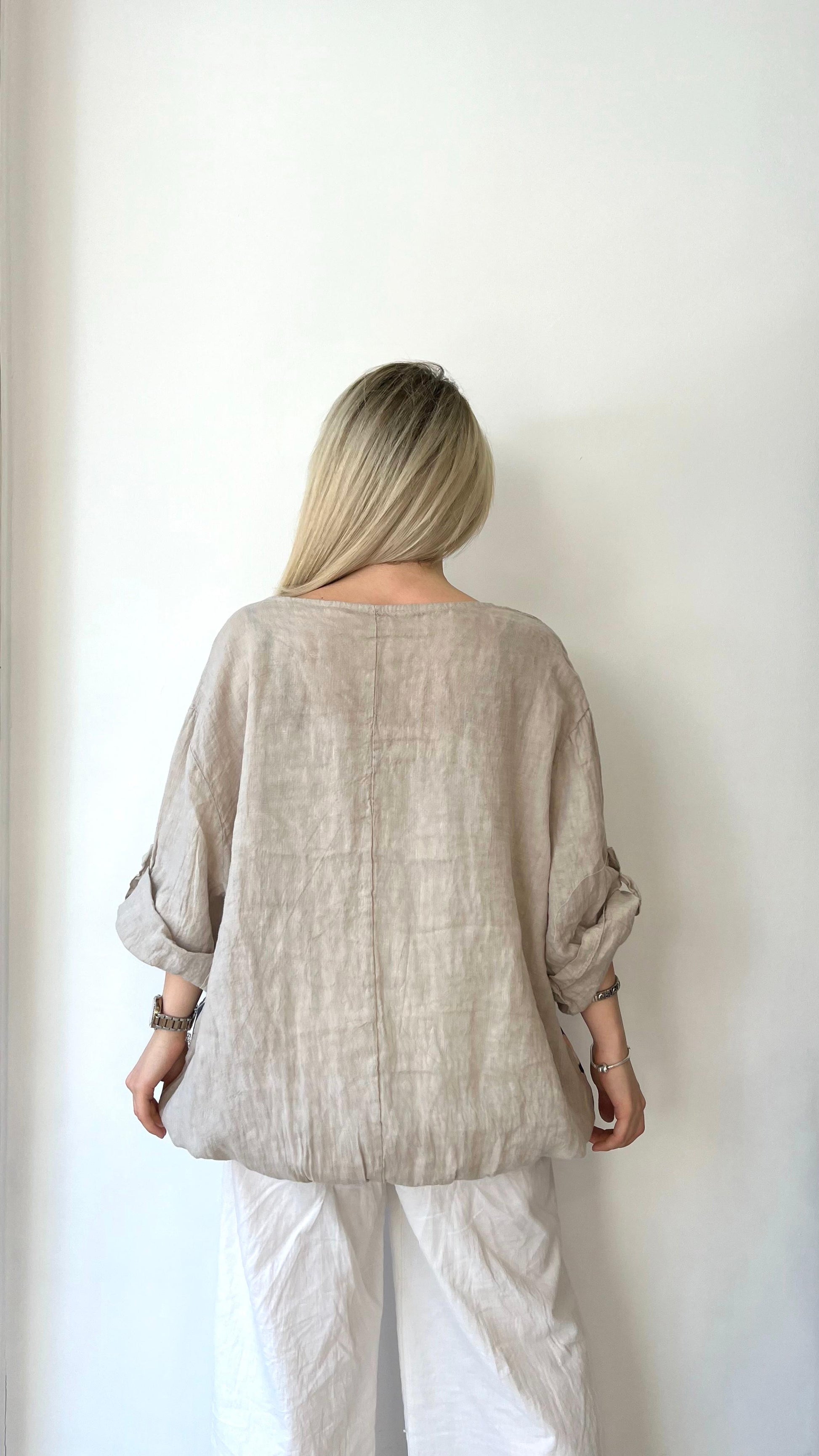 %100 keten, çiçek baskılı, beli ip bağlamalı, rahat kalıp bluz.