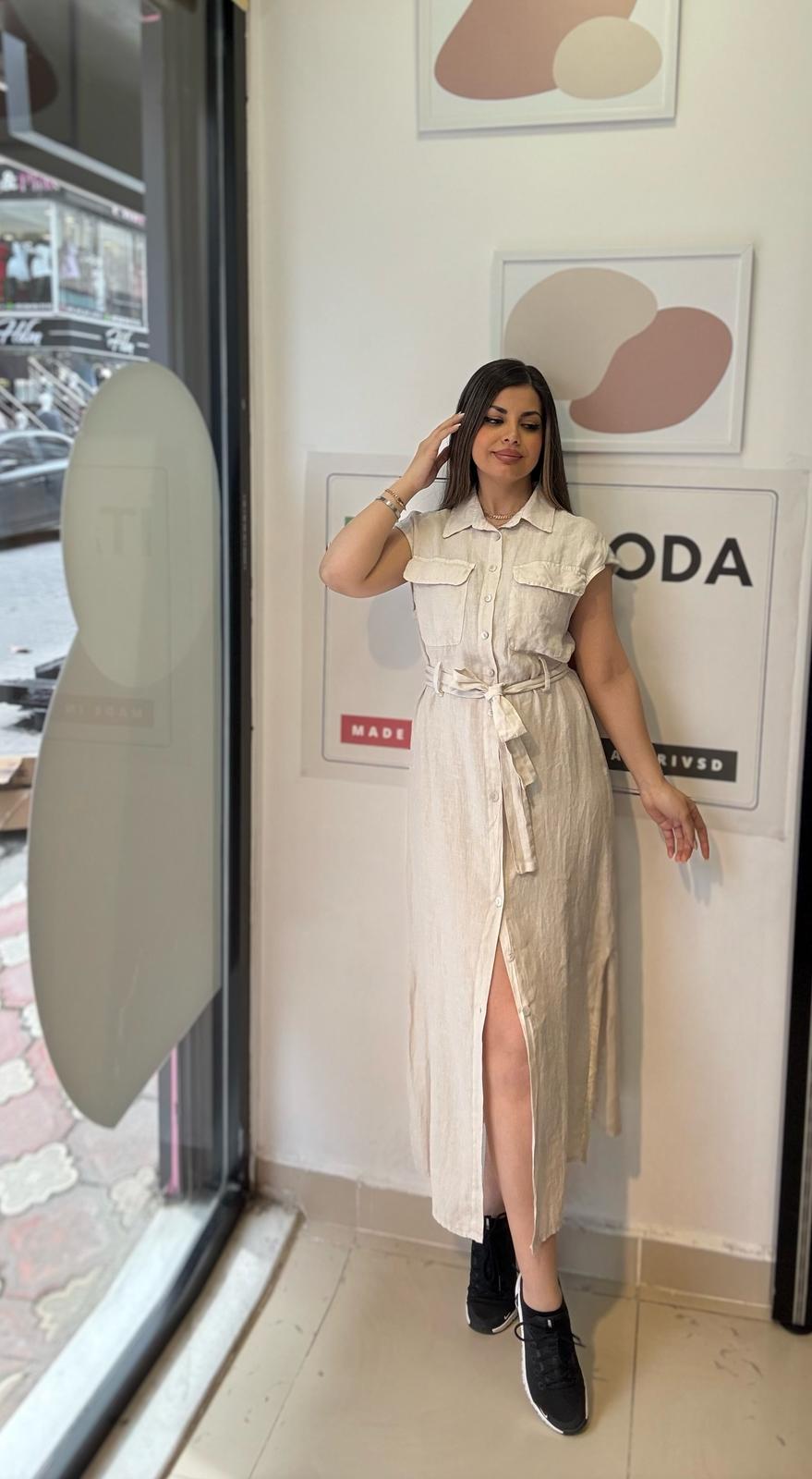 Bej, %100 Keten, Eteği Yanlardan Yırtmaçlı, İtalyan Gömlek Elbise / STD Beden-38/46