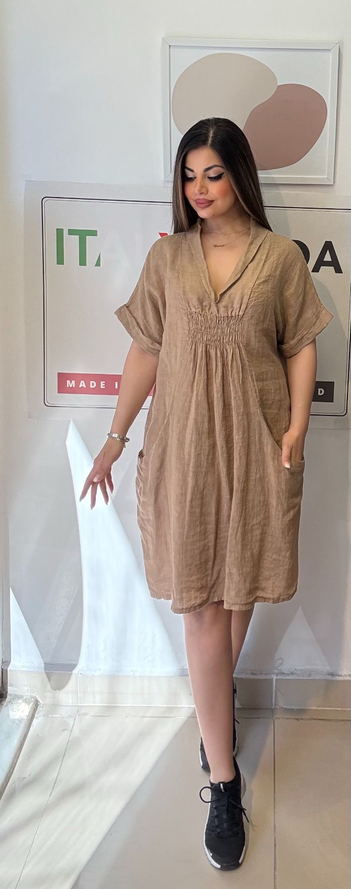 Camel, %100 Keten, V Yaka, Cepli, Gipeli, İtalyan Elbise / STD Beden-38/46
