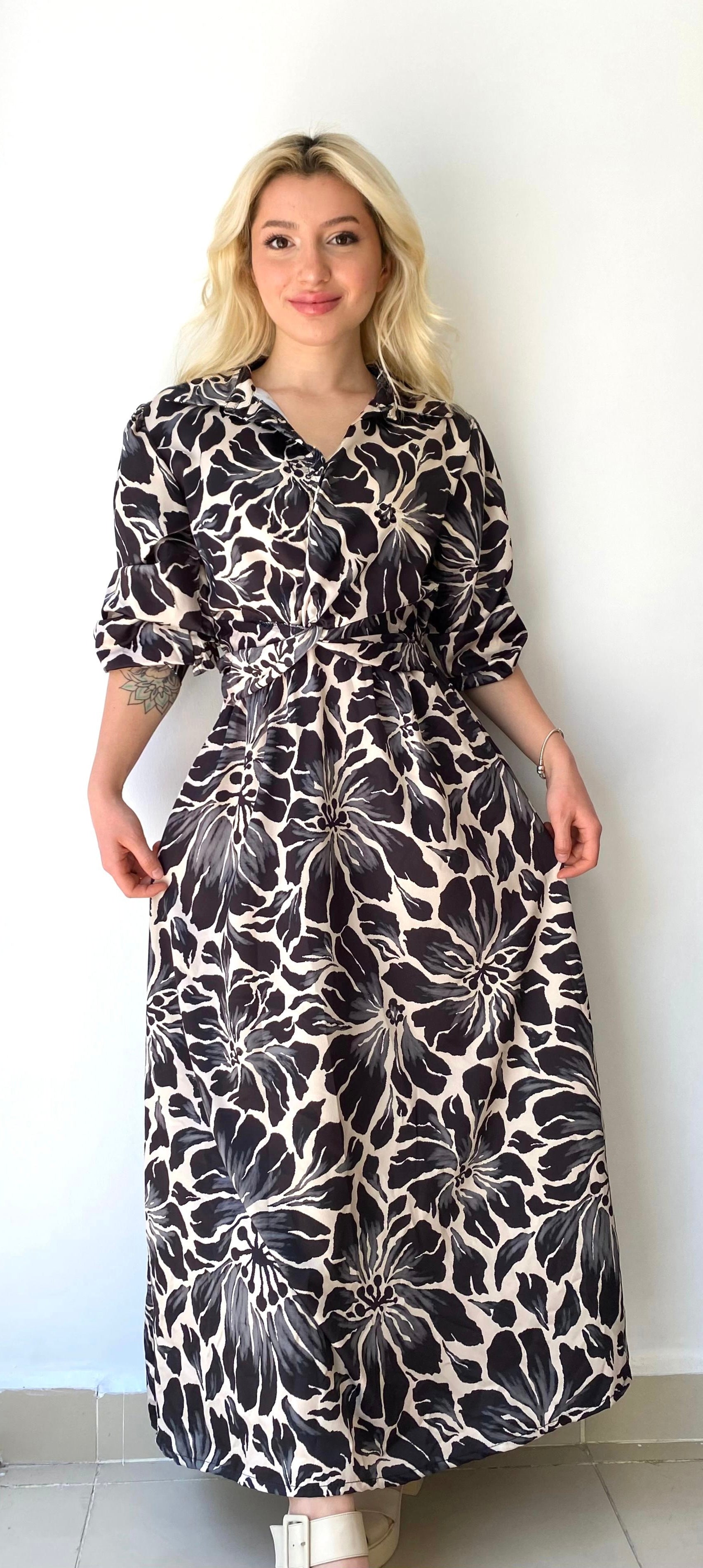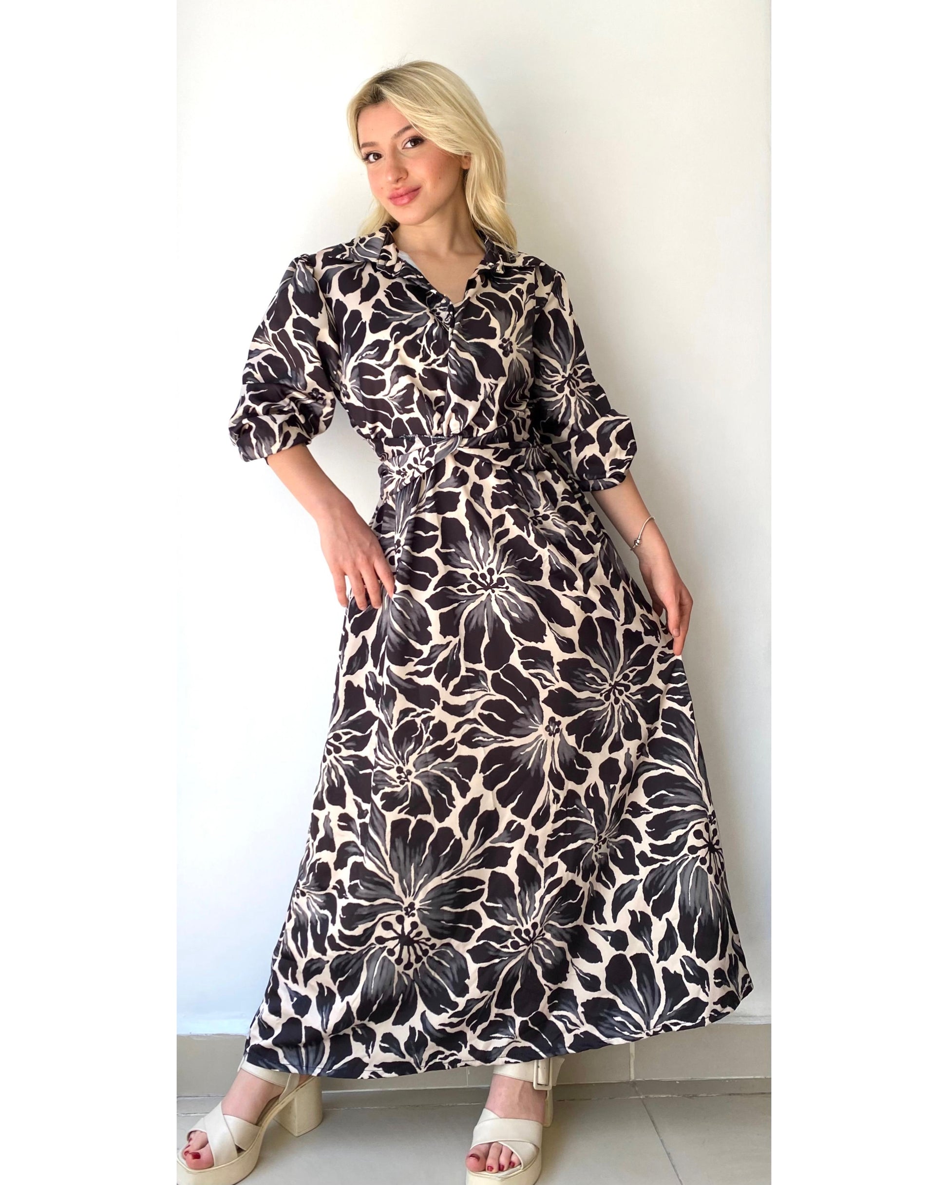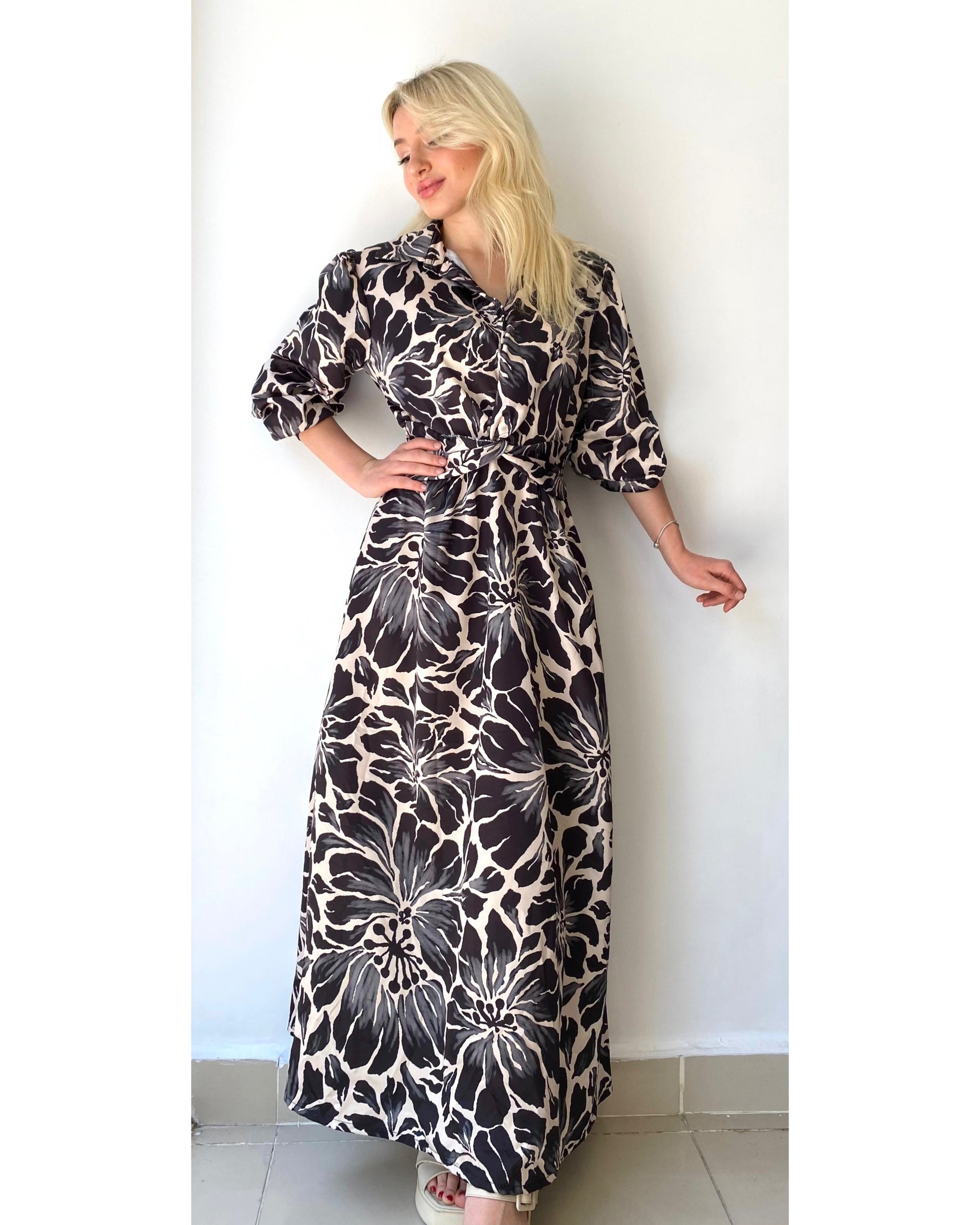 Siyah ve bej tonlarında, çiçek desenli, beli lastikli, standart beden, uzun kadın elbise. Manken Ölçüleri: Boy 1.60 cm, Kilo 49
