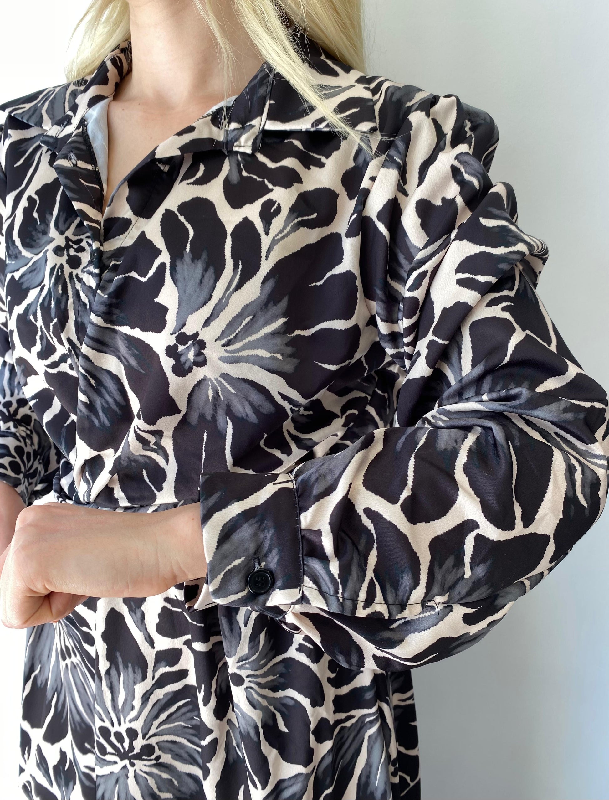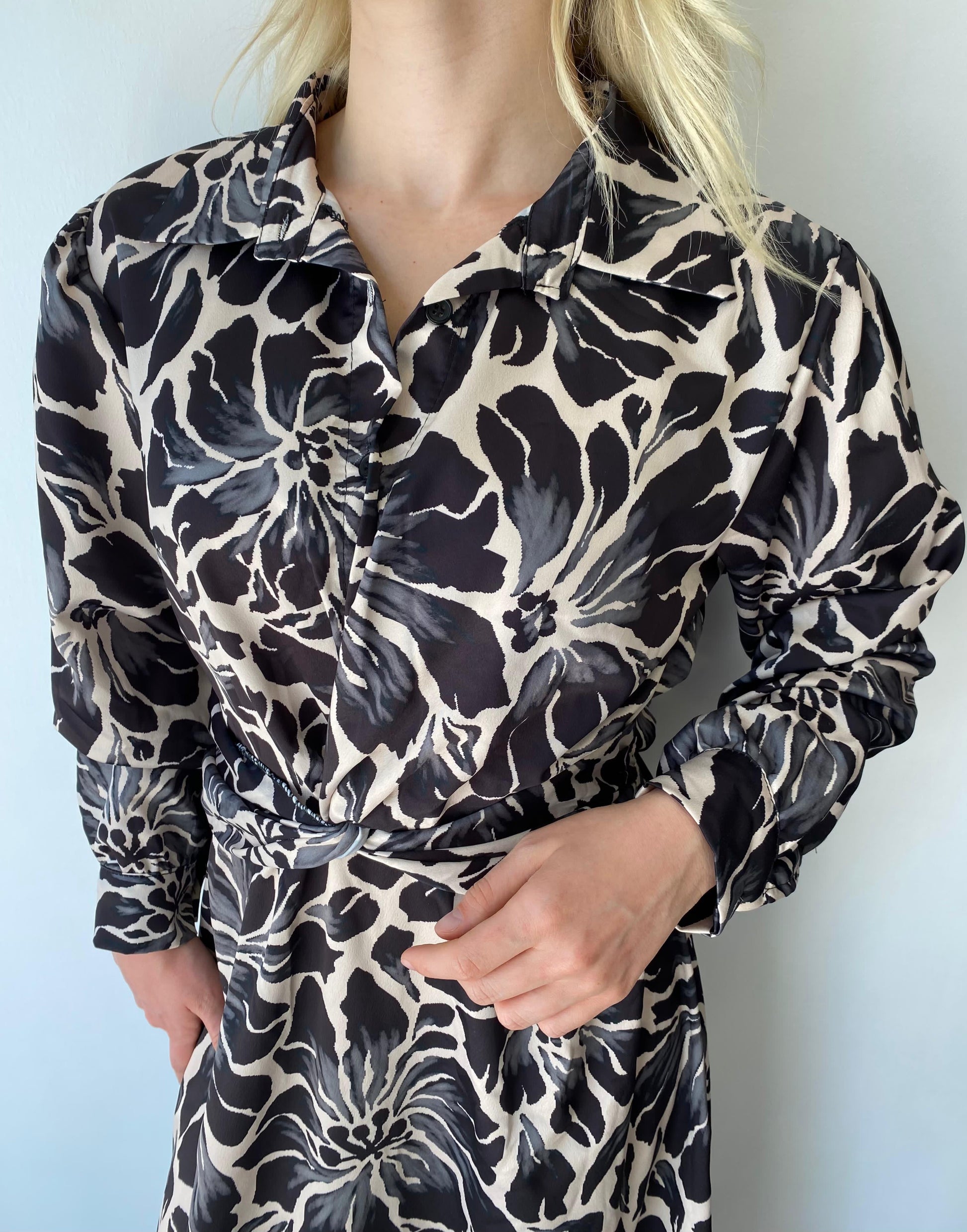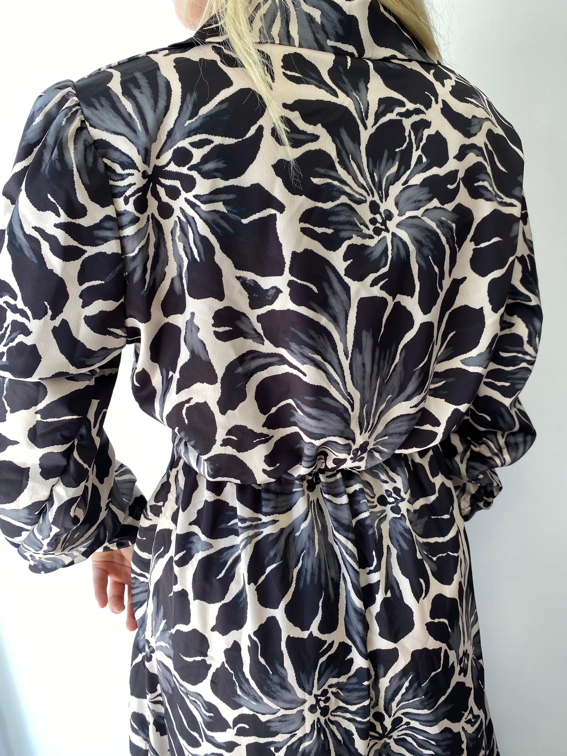 Siyah ve bej tonlarında, çiçek desenli, beli lastikli, standart beden, uzun kadın elbise. Manken Ölçüleri: Boy 1.60 cm, Kilo 49