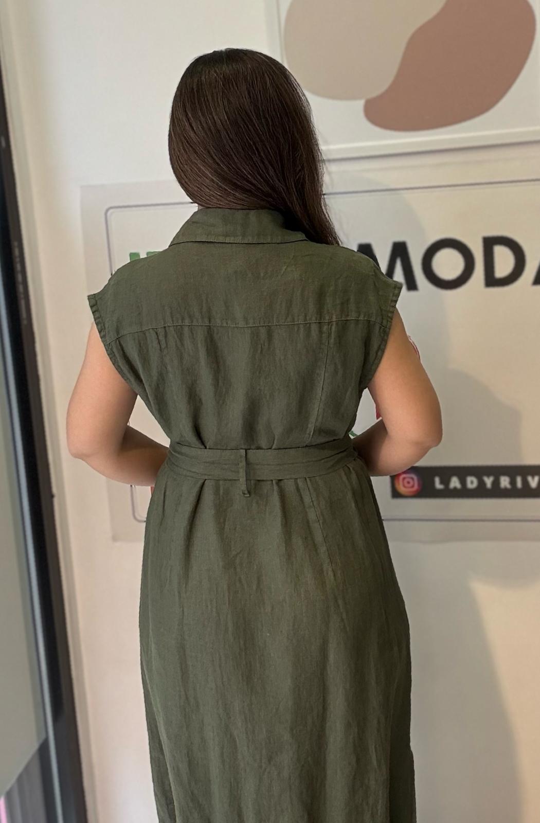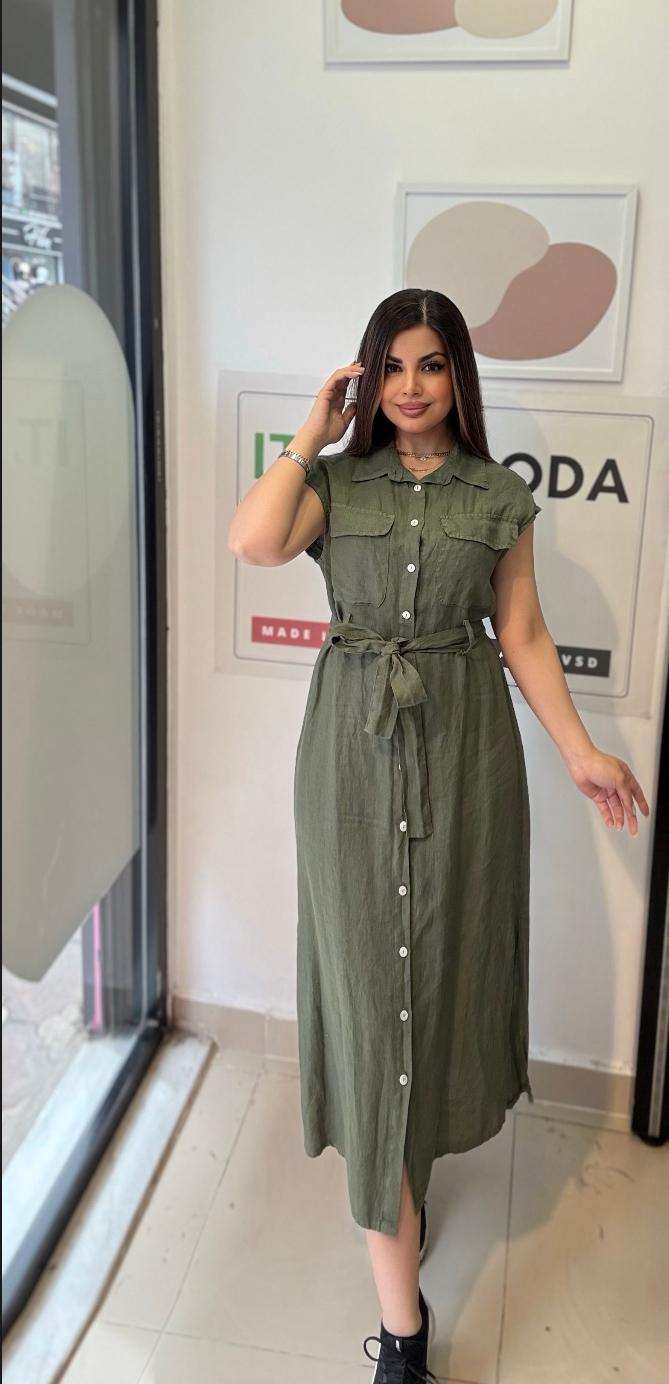 Haki, %100 Keten, Eteği Yanlardan Yırtmaçlı, İtalyan Gömlek Elbise / STD Beden-38/46