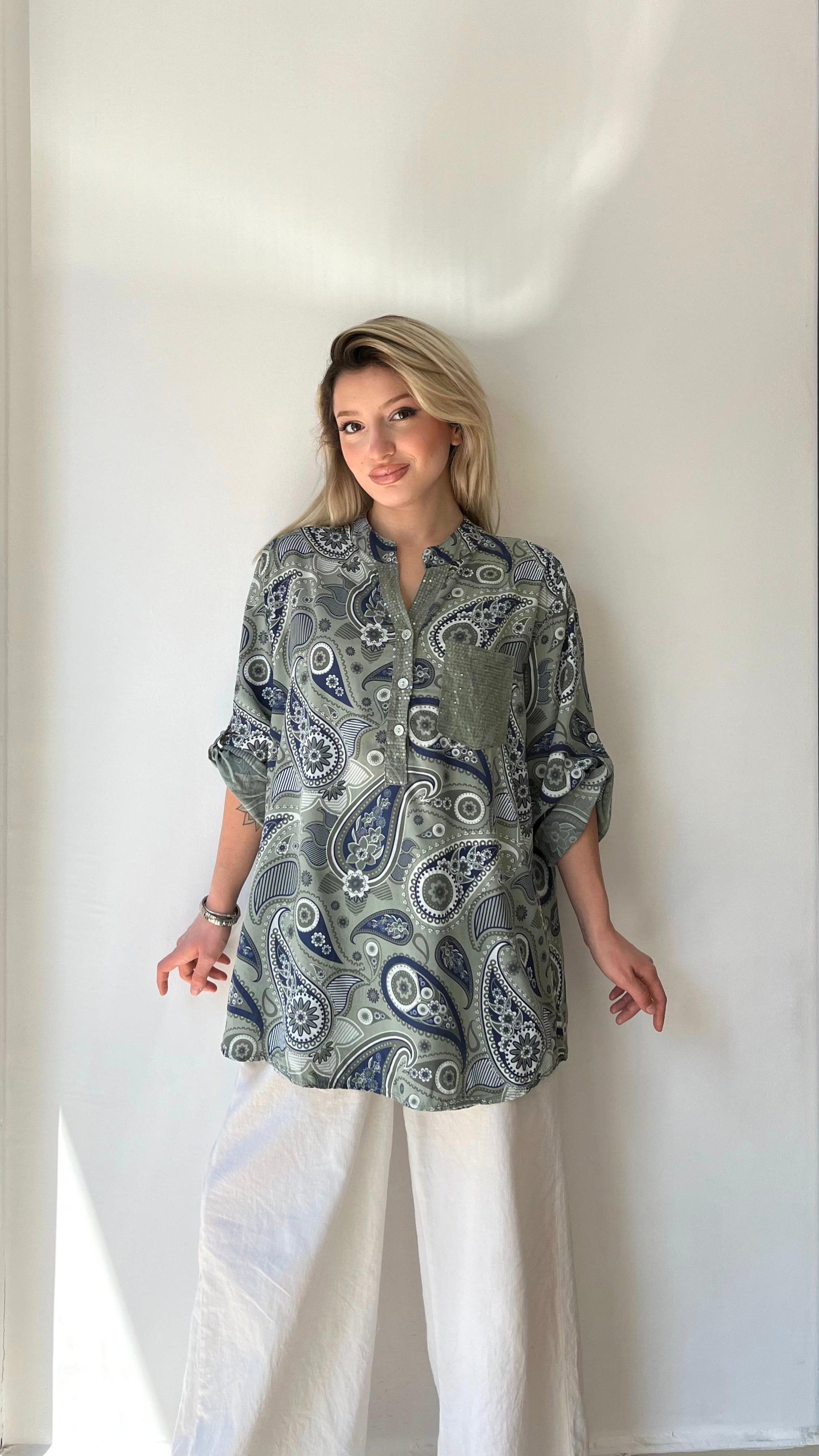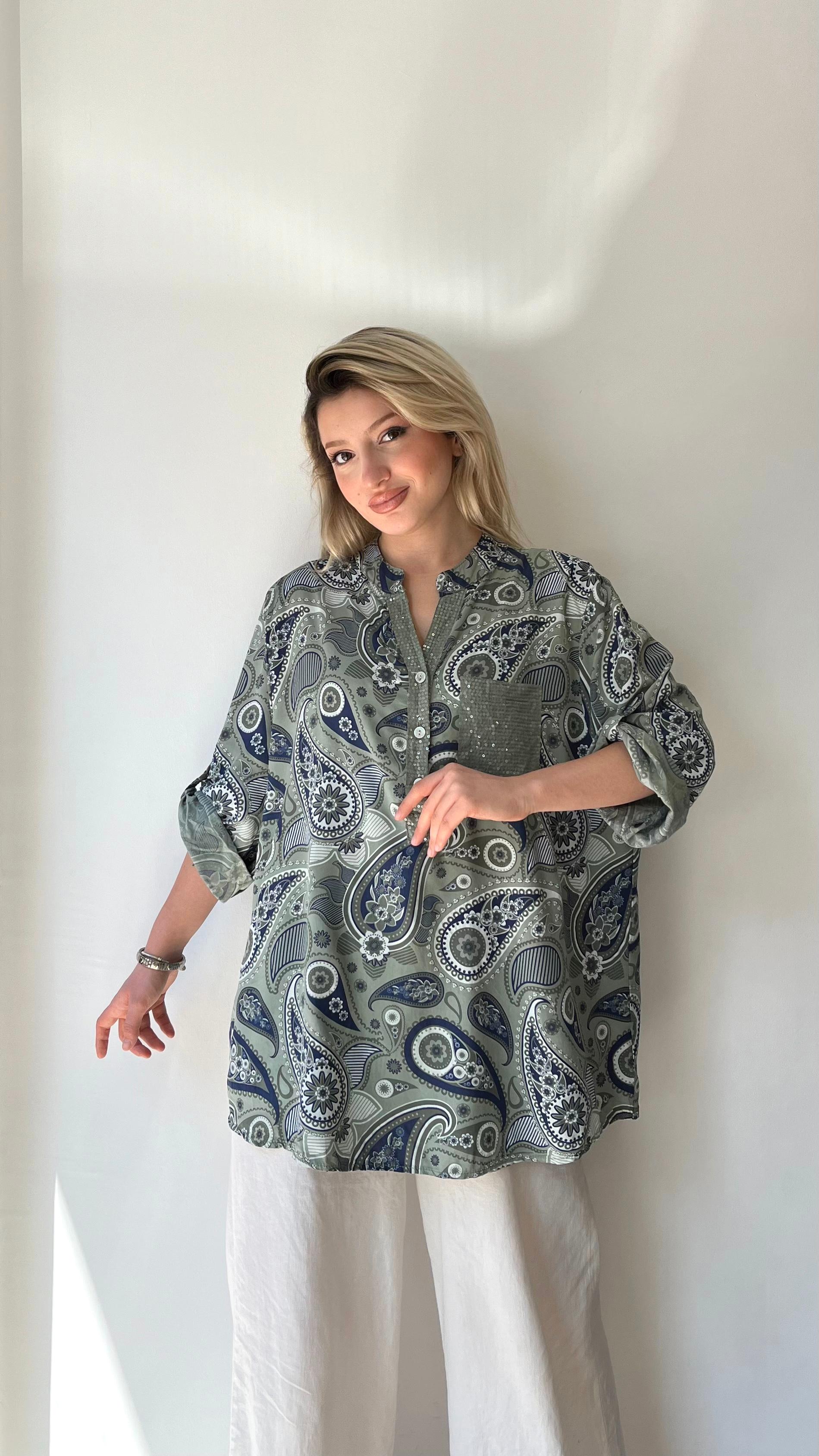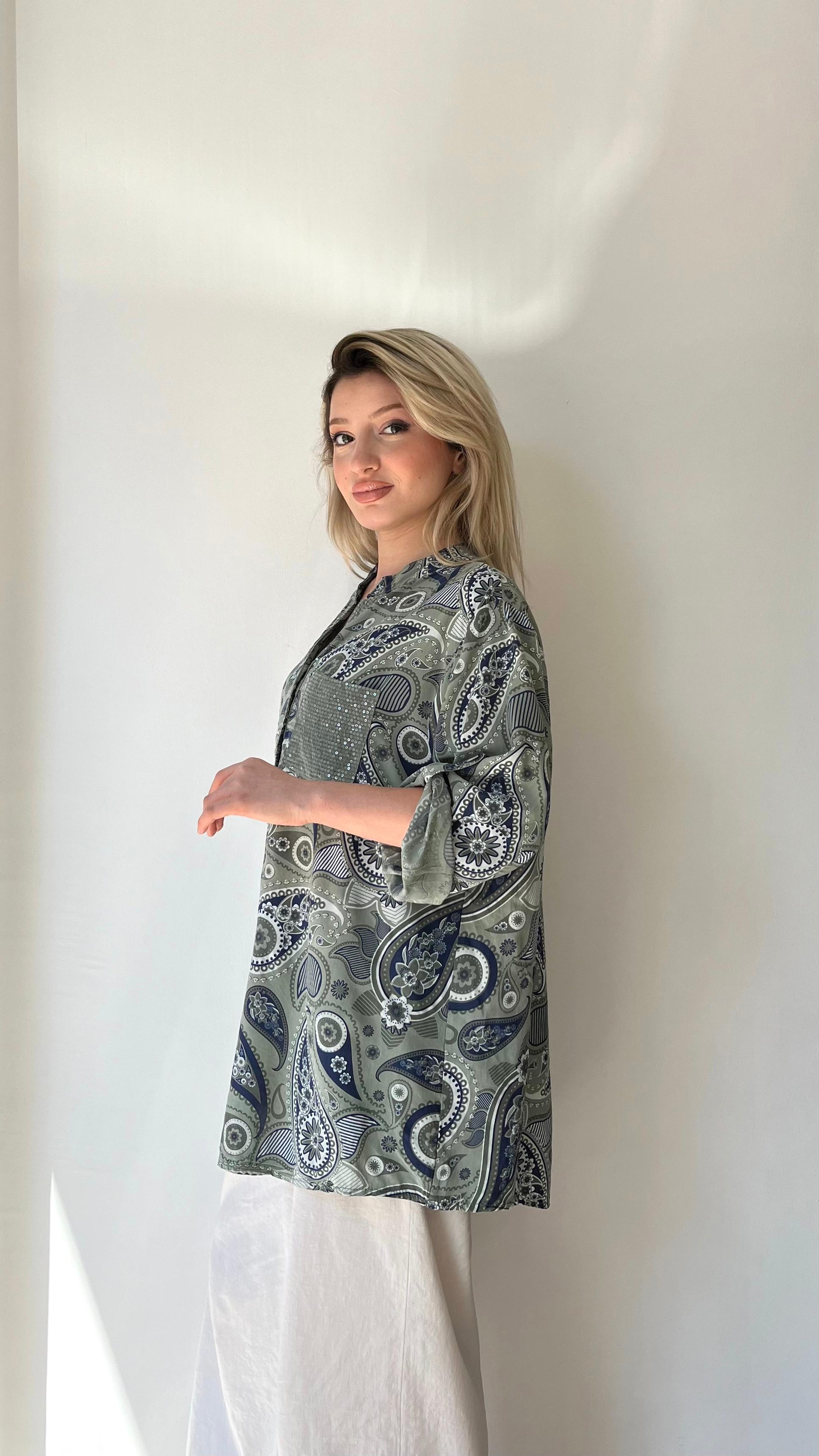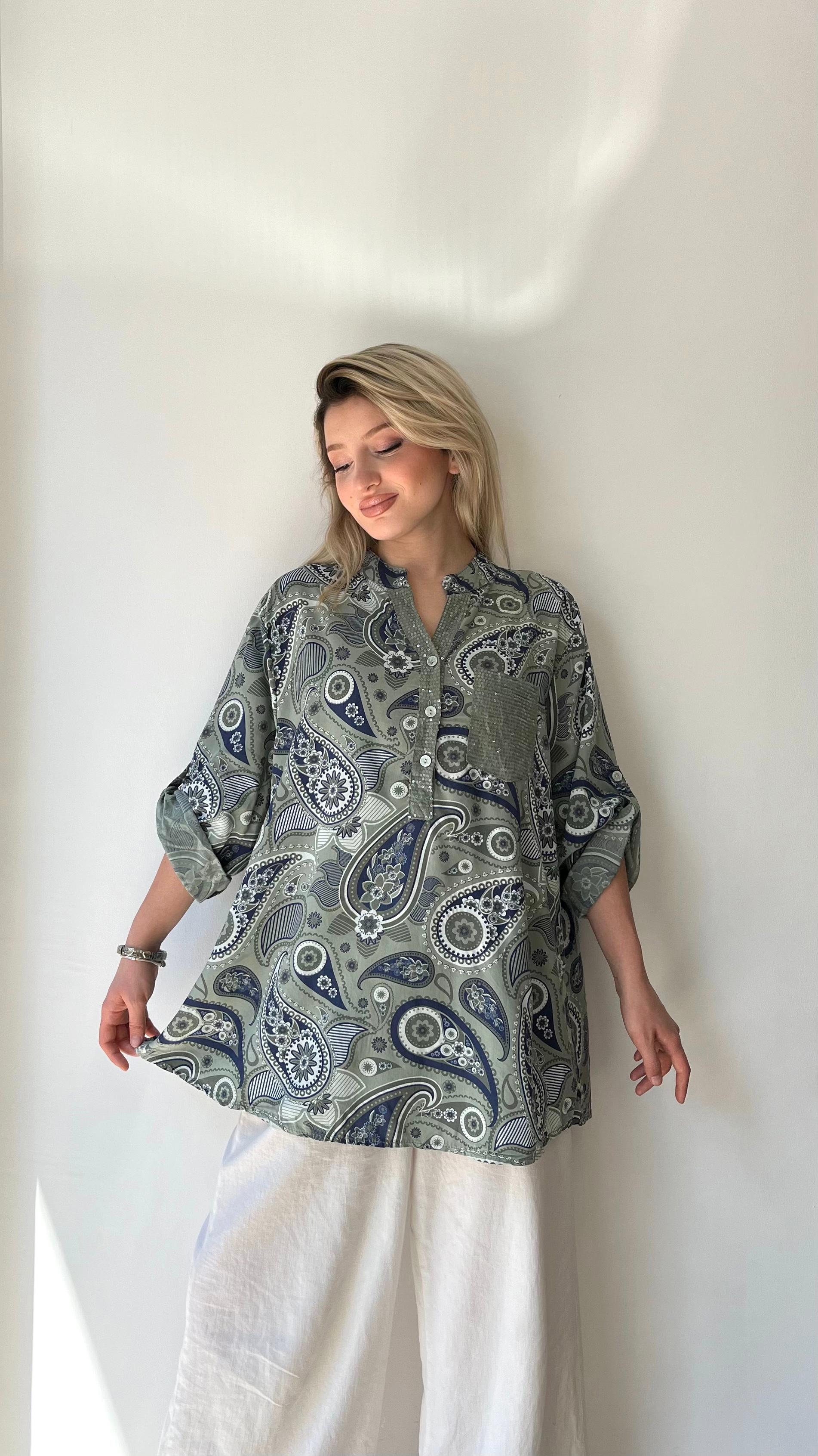 100% viskon, cep ve ilikleme kısmı payetli, desenli gömlek.
