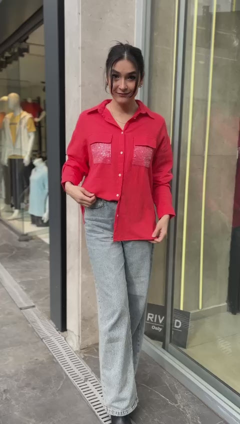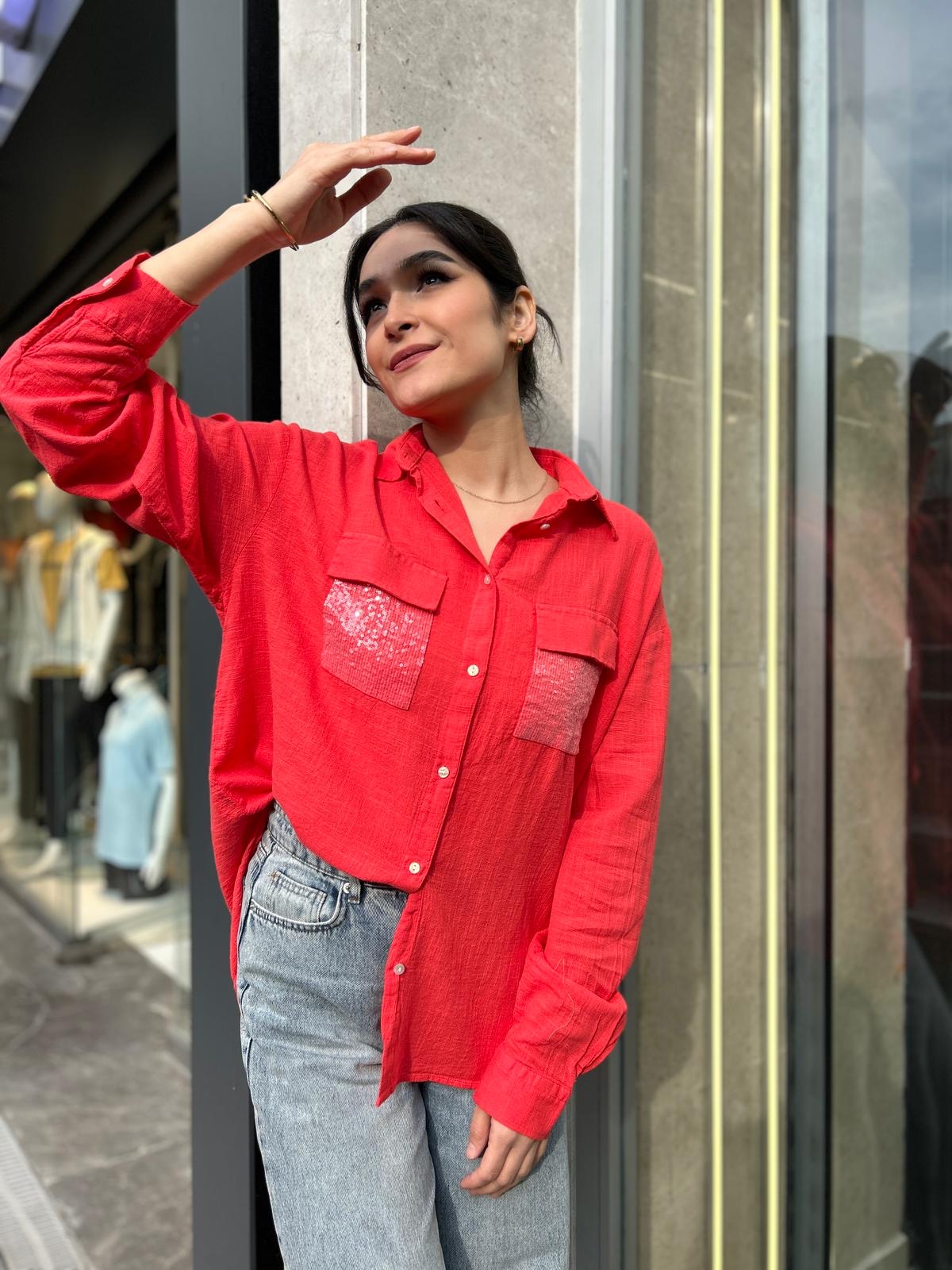 Kırmızı, %100 Pamuk, Cep Kısmı Payet İşli, Dokulu Gömlek / STD Beden, 36/42